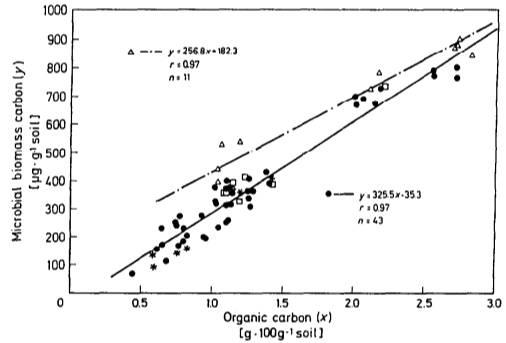 Regression lines correspond to the following amendments: Black circle: mineral, Triangle: green manure Plots with a square are not included in the regression. Sites I I and 25 are omitted because of their high carbon contents, see text.