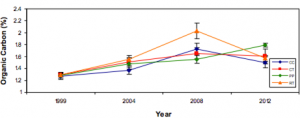 Soil organic carbon increased across all systems until 2008. In years from 2008 to 2012 there was a steep decline in soil organic carbon across all systems except for the pasture phase.