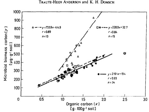 The above graphs show the microbial populations increasing as the organic carbon within the soil profile increases. Ideally we would like to see a linear relationship between organic carbon and microbial biomass, which is shown in the rotational cropping graph but not the continuous cropping graph. So lets look at why the rotational cropping system is converting organic carbon to microbial biomass more efficiently than the continuous cropping system.