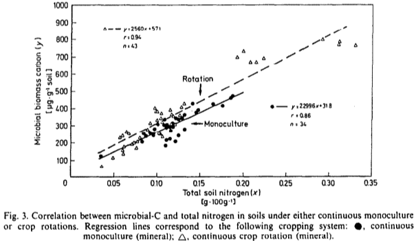 So now that we know that microbes in mixed cropping systems are capable of converting soil carbon to microbial biomass a lot more effieciently than microbes in continuous cropping systems. The above graph reinforces the benefits of microbes under mixed cropping systems with the two plots been compared in the same graph. As you can see the mirobes in the mixed cropping system are responding much better to the nitrogen source than the microbes in the continuous cropping system.