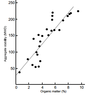 Figure 1: Relationship between aggregate stability and organic matter content for 26 soils (redrawn from