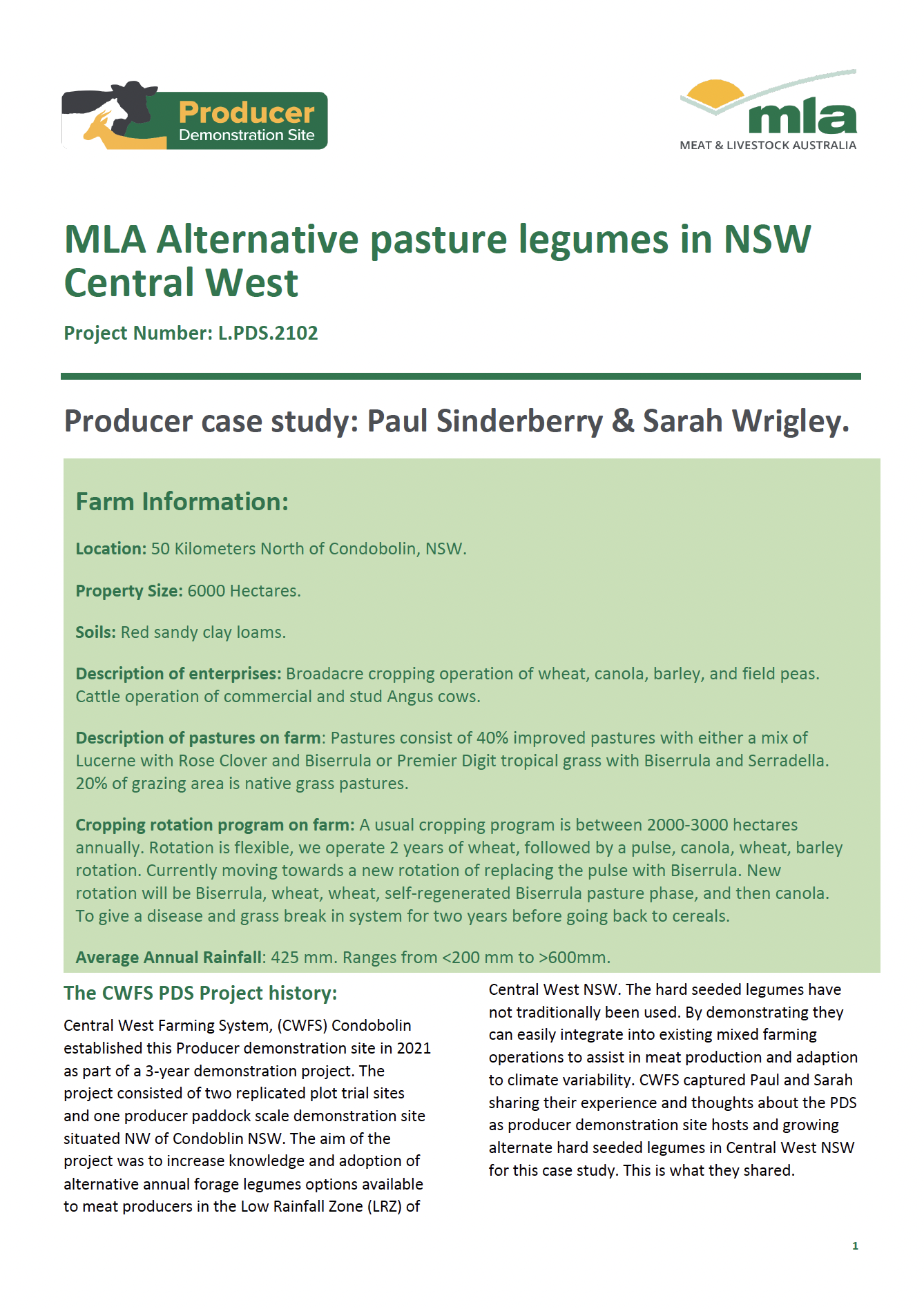 The CWFS MLA Producer Demonstration Site (PDS) ‘Alternative pasture legumes in NSW Central West’ is in its first year. It aims to increase knowledge and adoption of alternative annual forage legume options available to livestock producers in the low rainfall zone (LRZ) of Central West NSW that have not traditionally been used. The project will showcase how they can be easily integrated into existing mixed farming operations.