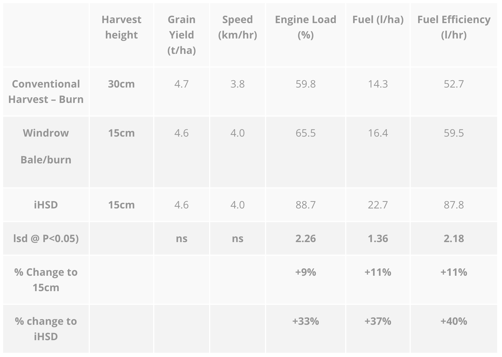Table 3: A Case 9120 harvesting wheat conventionally at 30cm, harvesting at 15cm for baling or narrow windrow burning and harvesting at 15cm with a prototype iHSD at Furner, SA in 2016. (Data supplied by GRDC project SFS00032)