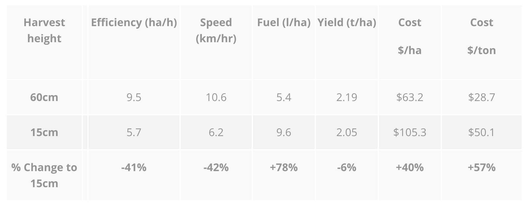Table 2: Harvesting wheat low or high using a Case 8230 combine with a 13m front in 2015 (ref 7). Ground speed was altered to achieve similar level of rotor losses at both harvest heights. Operating costs determined at $600/hr.