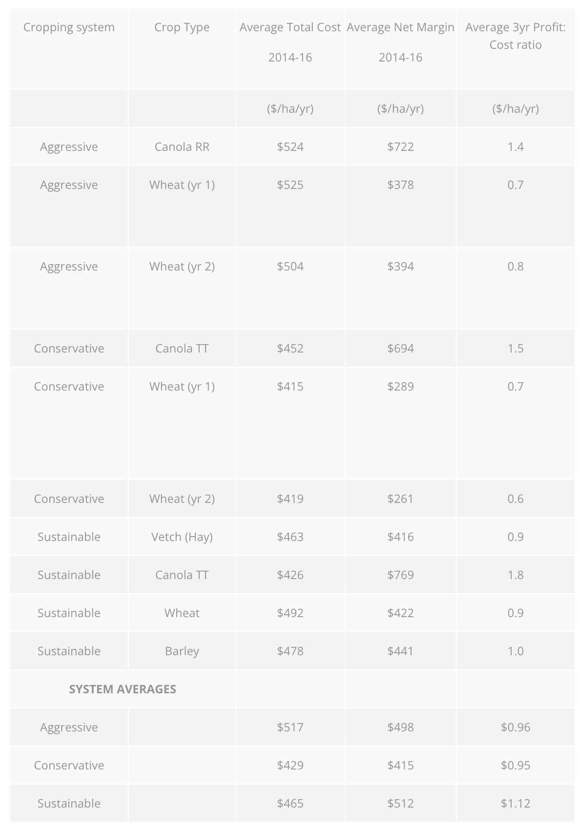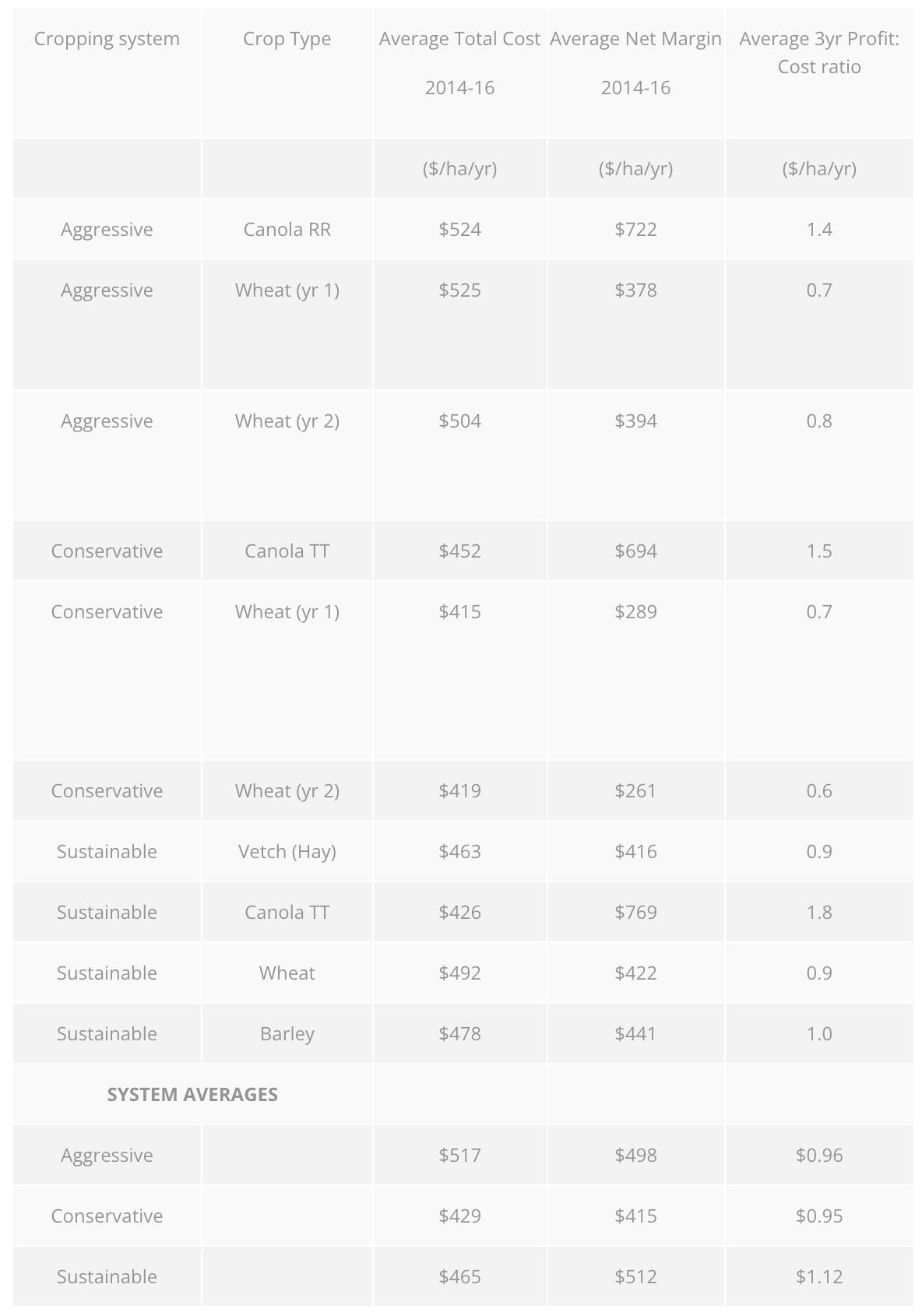 The introduction of diversity in the Sustainable system has allowed it to achieve a net margin ($512/ha/year) which is higher than in the Aggressive systems ($498/ha/year) and at lower cost ($465 cf $517/ha/year) and thus higher profit:cost ratio ($1.12 cf $0.98) (Table 6). The reduced costs in the Sustainable system are driven by lower fertiliser N inputs from the inclusion of vetch hay, which requires no fertiliser N itself and provides residual N for subsequent crops. The barley phase of the Sustainable system has also been more profitable than the second wheat crop in either the Aggressive or Conservative system (Table 6), despite record low barley prices in this 2016/17 season.