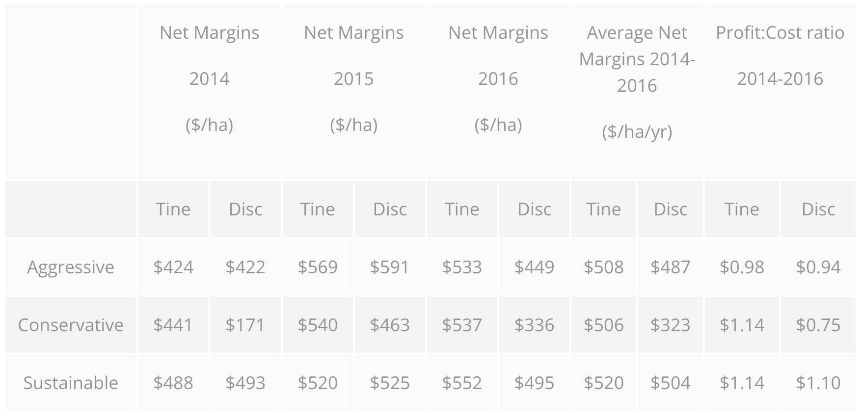 It has been well documented that a disc seeder can handle higher stubble loads in comparison to a tined seeder, have less variability in seeding depth and higher sowing efficiencies than a tined seeder. Over the three year trial at Temora, there has been little difference in the net margin of either the disc or tine openers where ARG was effectively controlled by pre-emergent herbicides in the Aggressive and Sustainable cropping systems. However, in the Conservative system, the combination of trifluralin and diuron were able to achieve a reasonable ARG control in the tined system, but diuron alone was largely ineffective in the disc system, and this has reduced yields and profit in this system (Table 7).