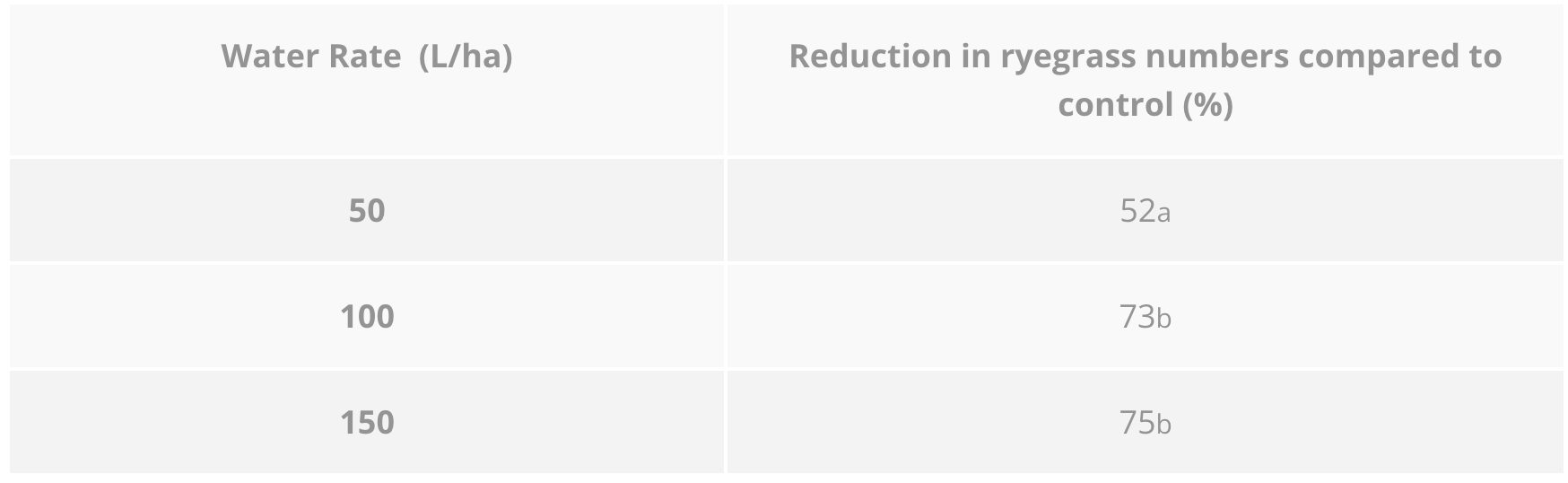 Table 13: The reduction in ryegrass populations with increasing water rate in the LEP in 2015