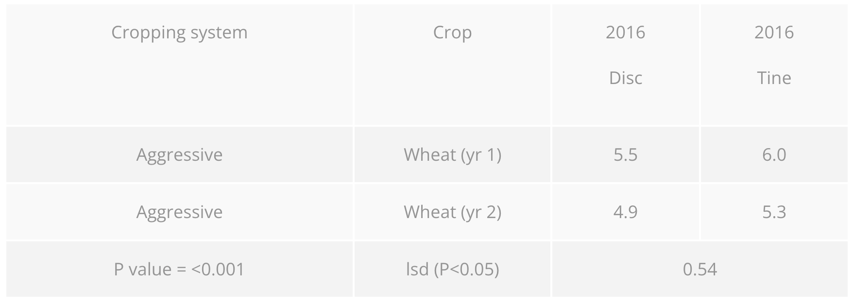 Southern Farming Systems have been comparing the advantages of establishing crops with a disc and tined seeder over the past 3 years. They found that although there was no significant difference in wheat yield at the 95% confidence level (0.5 t/ha increase in yield at the 90% confidence level),