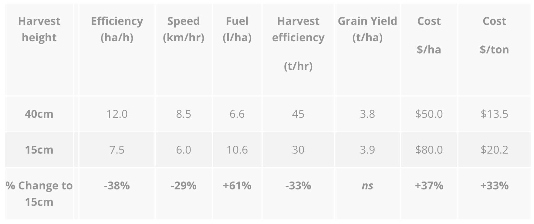 Table 1: Harvesting wheat low or high using a JD9770 combine in 2014 (Ref 7). Ground speed was