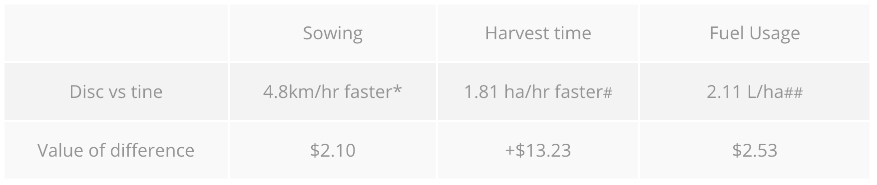 (* contract sowing at $45/hr, # increased speed at harvest $400/hr, ## fuel @ $1.20L)