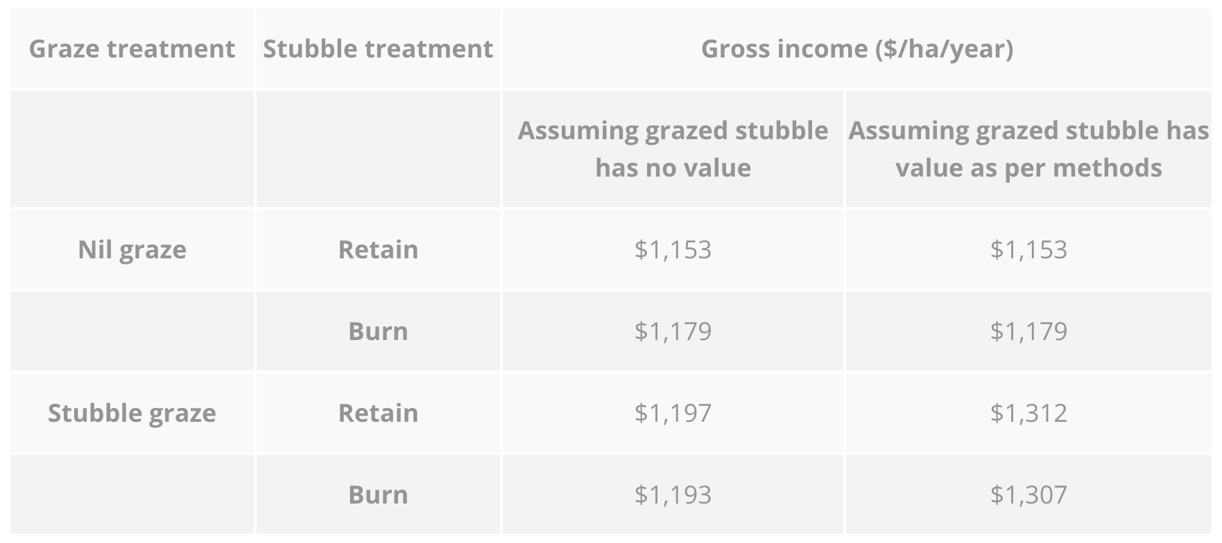 Table 10: Gross income per year averaged across two phases where stubble was either grazed post-harvest or not, and either burnt just before sowing or retained, 2010-2015 at Temora, NSW.