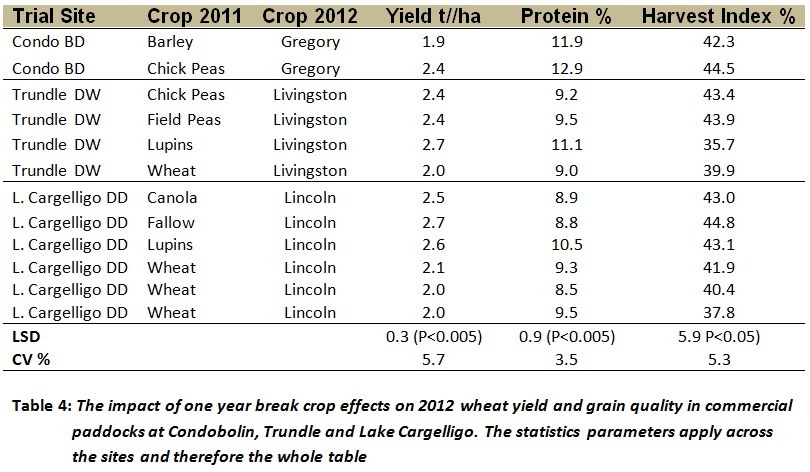 From a systems perspective the break crops out performed consecutive wheat crops due to the reduction in root diseases and nitrogen inputs. The break crop also provided an effective means of storing soil moisture as well as minimising in crop weed pressures.