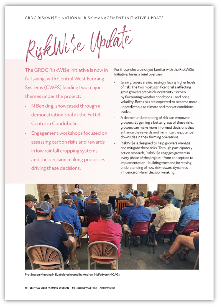 RiskWi$e (the National Risk Management Initiative), is a 5-year national initiative of approximately $30 million that will run from 2023 to 2028. It seeks to understand and improve the risk-reward outcomes for Australian grain growers by supporting grower on-farm decision-making. To do this it will: